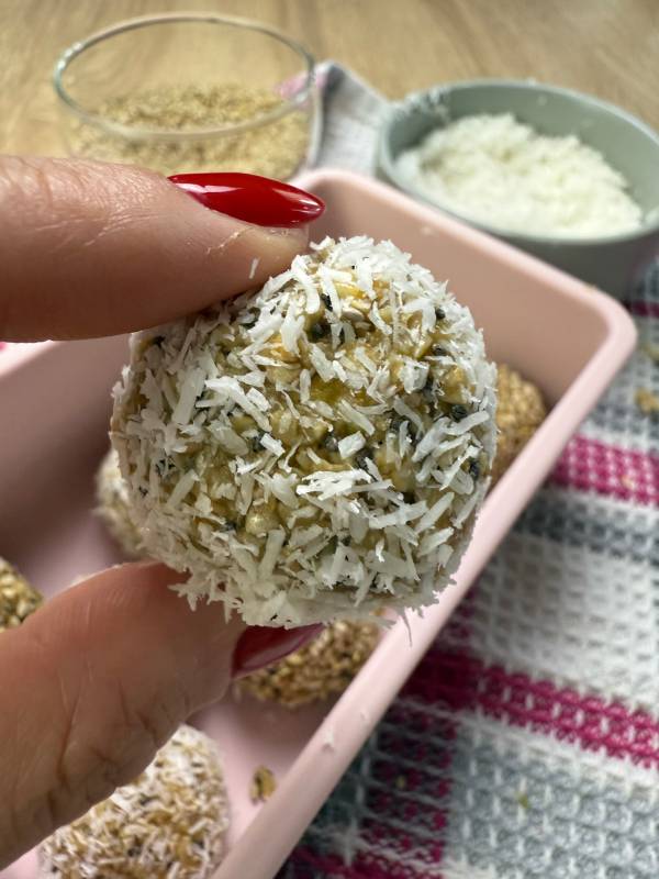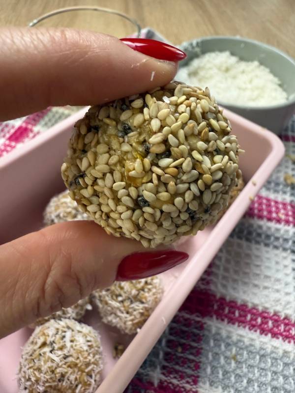 - Πασπαλίζω με σουσάμι ή καρύδα και κύλησε κάθε μπαλίτσα για να κολλήσει καλά.